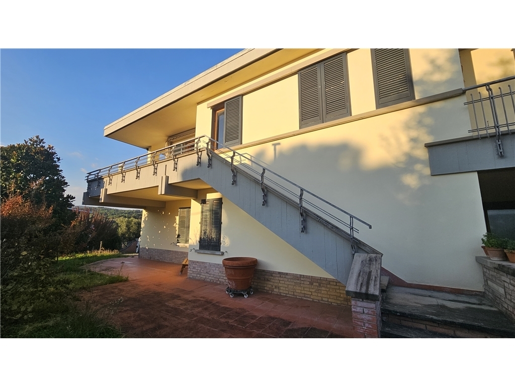 MONTELUPO VENDESI villa libera su 4 lati con 600 mq di resede giardino circostante con due ingressi carrabili. La villa di 450 mq è disposta su 2 piani piano terra e primo oltre locale soffitta utilizzato a studio con terrazzo. Al piano terreno, con altezza di 2.89 mt, si trova il grande ingresso principale con la scala posta sul perimetro dell' edifico, che accede al primo piano dove si trova l'abitazione con salone doppio , pranzo, cucina, grande disimpegno notte con 3 camere matrimoniali, doppi servizi. Questo piano è completato da 2 terrazzi di cui uno grande e servito da scala che accede al giardino.