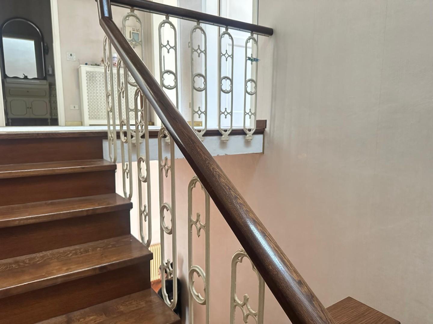 Il piano superiore, raggiungibile tramite una elegante scala in legno, ospita la zona notte composta da un ampio disimpegno, una camera padronale con cabina armadio e bagno privato dotato sia di vasca che di doccia, oltre a due ulteriori camere matrimoniali e un secondo bagno.
